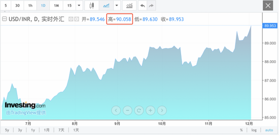 12月2日,印度卢比汇率持续走低,印度卢比兑美元汇率日内一度跌破重要心理关口90,最低跌至90.058,再度创出历史新低。